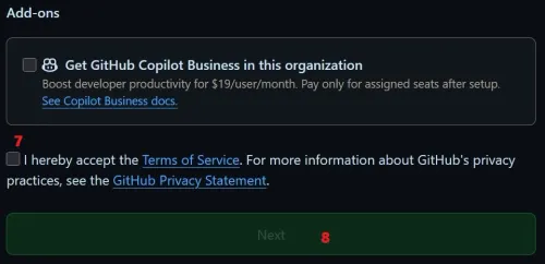 I) Coche la validation des " Terms of Service " 7 puis valide 8.
