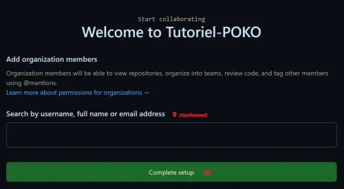 J) Optionnel Tu peux, si tu le veux, ajouter des collaborateurs 9 sur ton projet à cette étapes. Tu peut les chercher 9 Bis en cherchant leurs comptes GitHub. Il recevrons ensuite un mail qui les inviteras sur ton projet.