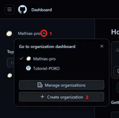C) Clique sur le menu déroulant 1 puis sur " Create Organization " 2.